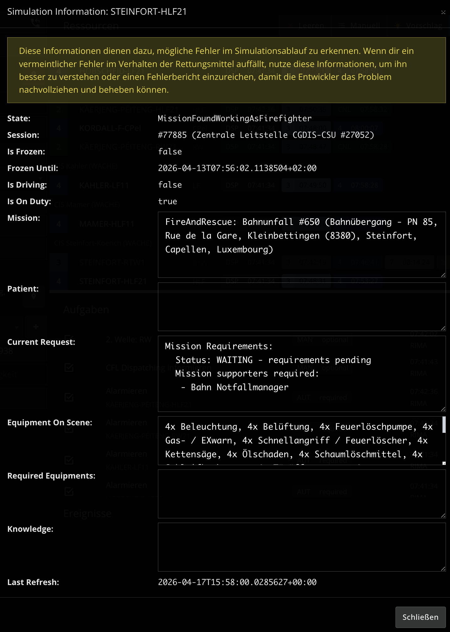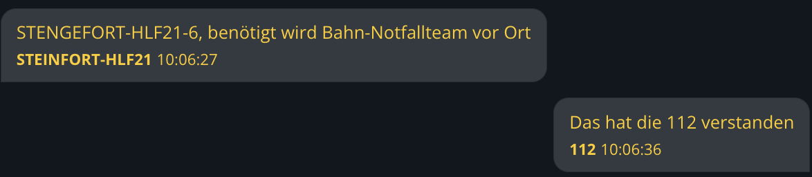 Beim Einsatz wird ein Bahn-Notfallmanager nachgefordert. Ich habe dafür die “Straßendienste” angerufen. Es gibt kein POI für Bahnnotfallmanager. Das HLF fordert mehrfach in den nächsten Minuten einen Bahn-Notfallmanager nach, welcher nicht zum Einsatz kommt.