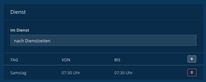 Richtig ist bei v4: Die Dienstzeiten genau so angeben, wie du sie beschrieben hast. Also: Neue Dienstzeit mit Tag Samstag, Start um 07:30 Uhr und Ende 07:30 Uhr.