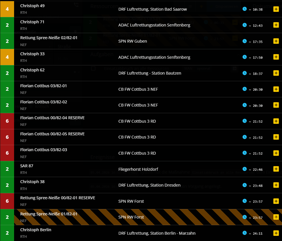 EO befinden sich in 03197 Jänschwalde. Stichwort mit Notarzt wird ausgewählt. Vorgeschlagen wird das NEF aus Forst (Lausitz), welches zwar die kürzere Distanz bezüglich der Luftlinie hat, allerdings 22:50 min benötigt (durch Umwege wie z. B. den Tagebau). Beim Öffnen der EM-Liste ist zu sehen, dass das NEF aus Guben deutlich schneller (16.50 min) wäre. Trotzdem erfolgt der Vorschlag für das NEF Forst. Eine überschreibende AAO ist hier nicht vorhanden.