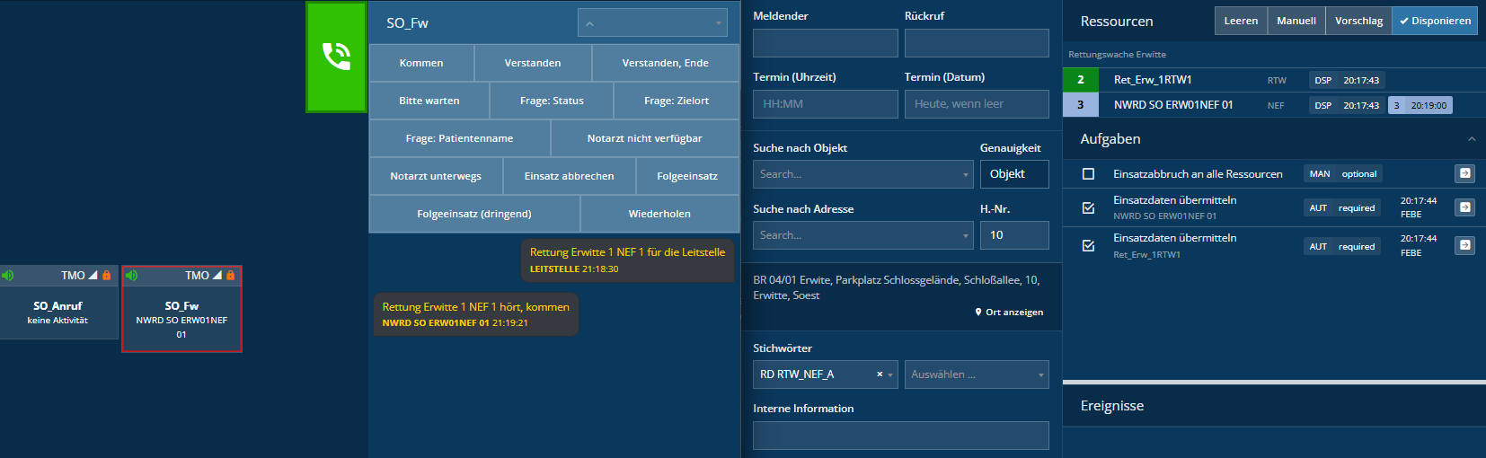 Auf dem Foto habe ich exemplarisch zwei Fahrzeuge – einen RTW und ein NEF – in einen Einsatz gezogen, um die Situation zu verdeutlichen. Der RTW zeigt bereits die interne OPTA-Kennung wie gewünscht an.