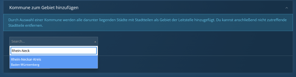 Hi. Ich hatte das selbe Problem. Hast du unter Gebiete deine Kommune bzw. deinen Landkreis hinzugefügt? Dann werden dir alle Gemeinden in diesem Kreisn angezeigt.