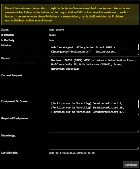 In bestimmten Fällen übernimmt das NEF fälschlicherweise den Patiententransport eigenständig in die Klinik. Der eigentlich zuständige RTW bleibt dabei konstant in Status 4. Auch auf manuelle Nachfrage hin startet der RTW keinen Transport, sodass ein „vergessener“ Statuswechsel ausgeschlossen werden kann.