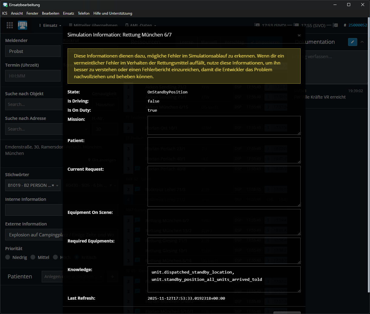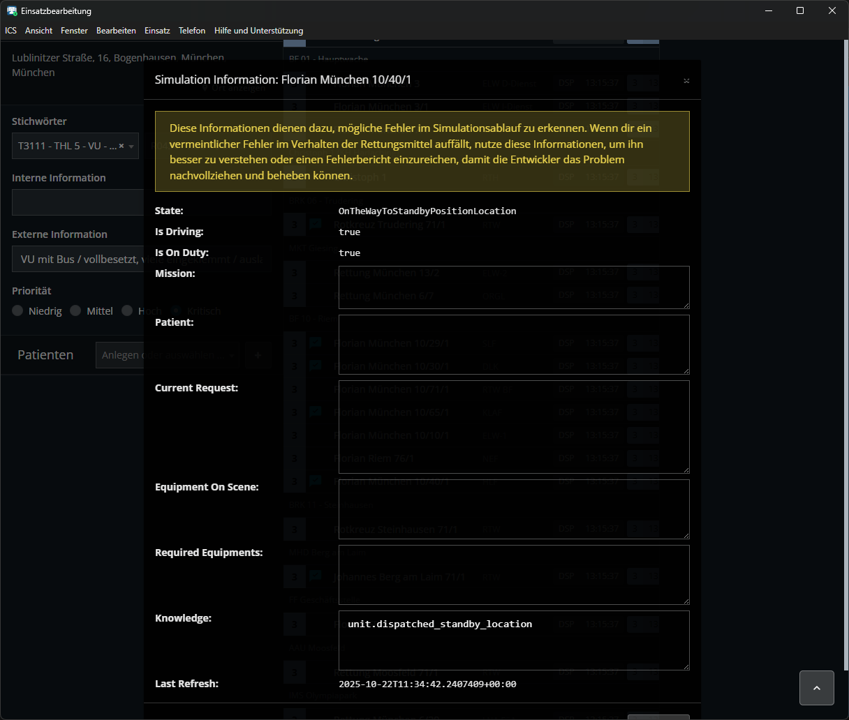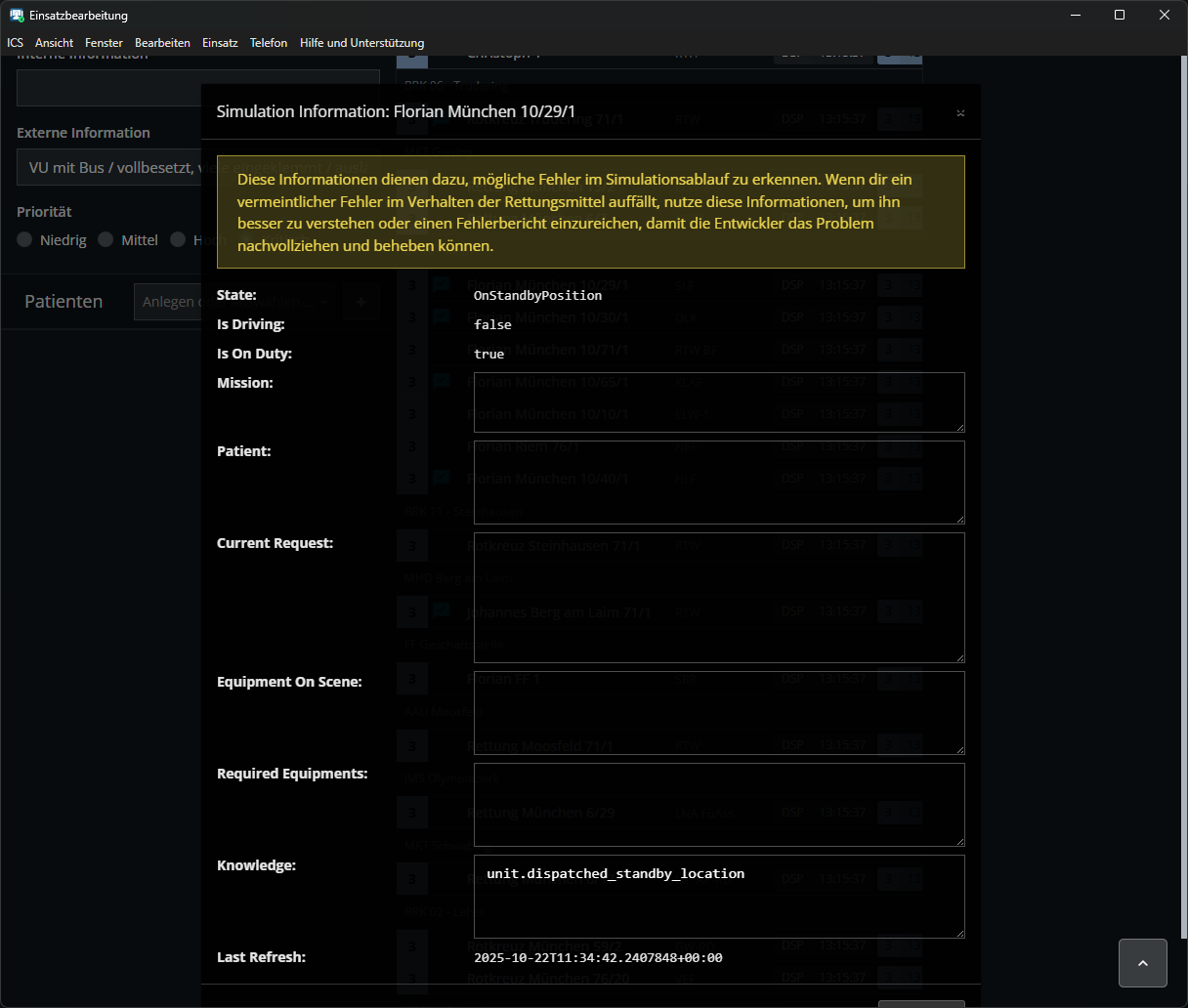 Heute erneut die gleiche Problematik. Nachdem wieder ein paar RM den Funk mit ihren Dringenden Sprechwünschen zugemüllt haben, habe ich resigniert und den Einsatz geschlossen und an alle Einheiten Einsatzabbruch gesendet. Einige Minuten später melden die RM allerdings, dass sie den Bereitstellungsraum erreicht haben, obwohl der Einsatz längst abgeschlossen sind und alle RM aus dem Einsatz storniert wurden