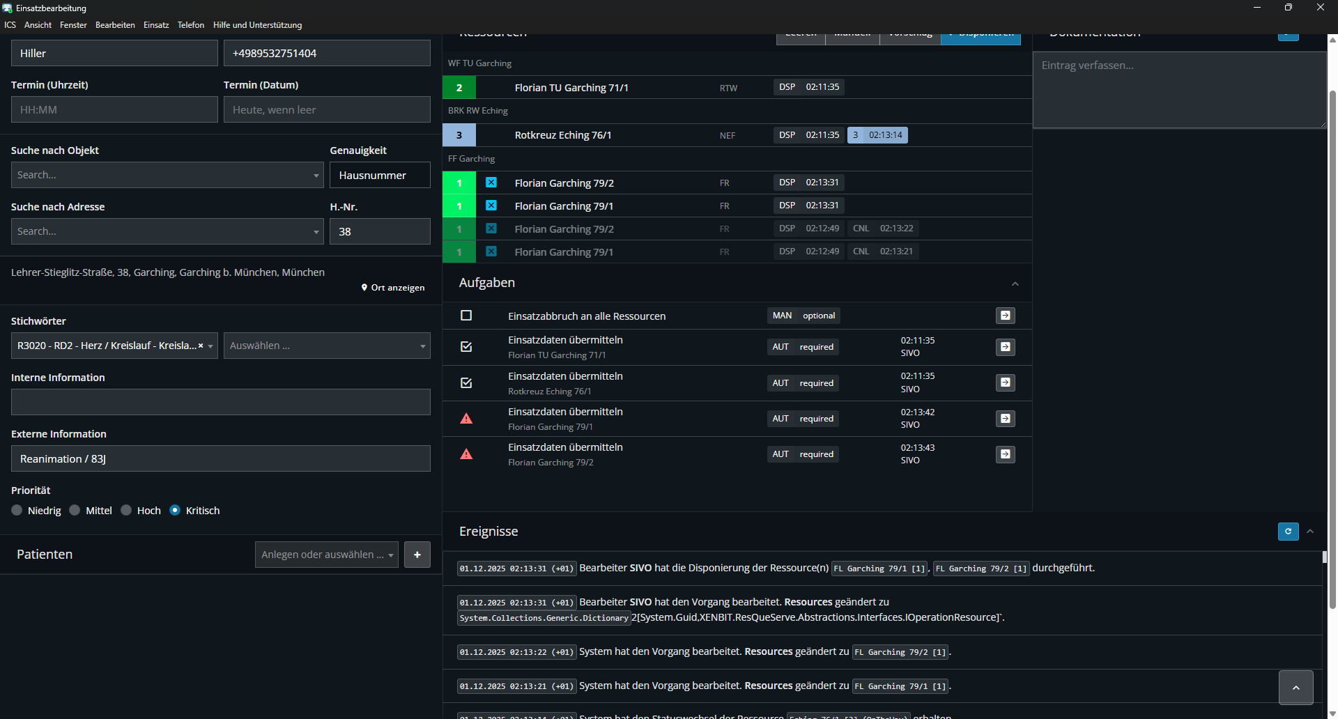 Das Problem wurde gesichtet, aber der eindeutige Fehler wurde noch nicht gefunden. Es wird höchstwahrscheinlich daran liegen, dass die Ressource in einem anderen Einsatz gebunden ist. Da sie aber in Status 1 ist, dürfte dies eigentlich nicht der Fall sein.