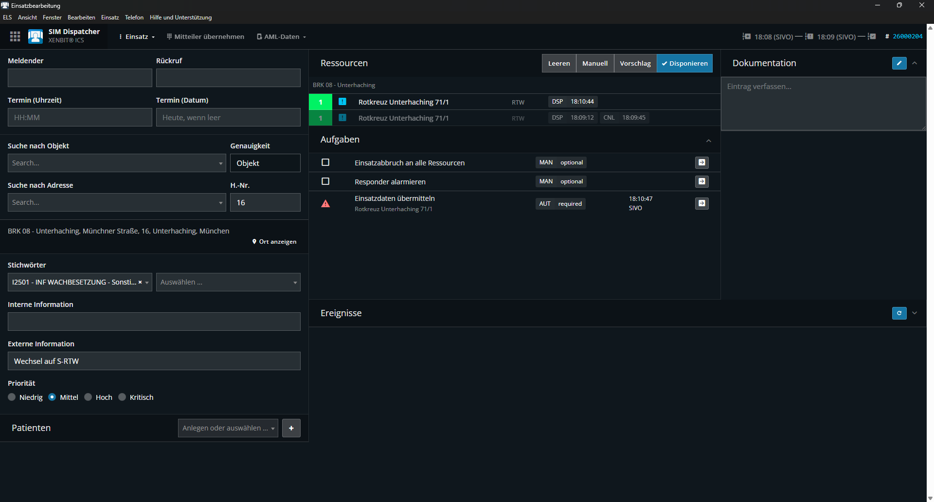 Das Problem tritt nun wieder auf. Bei Einsatz A hat der RD eine DL zur Rettung nachgefordert, alle Rettungsmittel sind aber in dem Einsatz festgebuggt und sind nicht weitergefahren (andere Bugmeldung folgt). Ich habe sie manuell storniert und in Status 1 gesetzt. In dem nachfolgenden Einsatz B für den RTW können die Einsatzdaten aber nicht übermittelt werden, so wie in der ursprünglichen Bugmeldung.